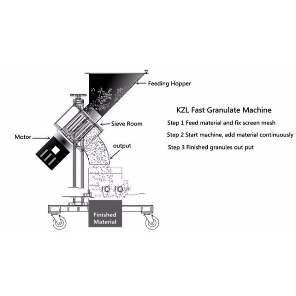 Adding raw material from feeding hopper and fixing the granulating knives. The material goes into the sieve room and touches screen mesh of high rotating speed. The fixed granulating knives crush larger particles by centrifugal force. The whole progress is finished when the required material put out.